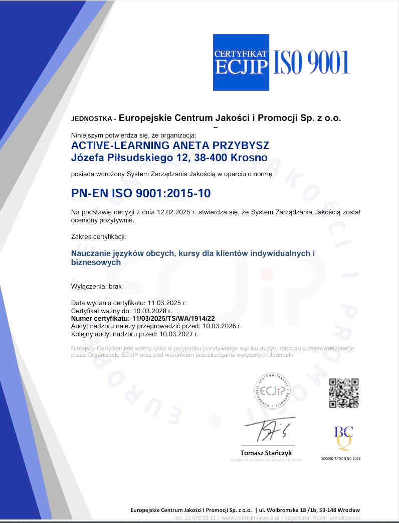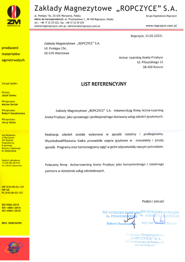 Naszą jakość potwierdzają rygorystyczne normy ISO oraz zaufanie liderów rynku, dla których od lat realizujemy skuteczne szkolenia językowe zorientowane na wymierne efekty biznesowe.